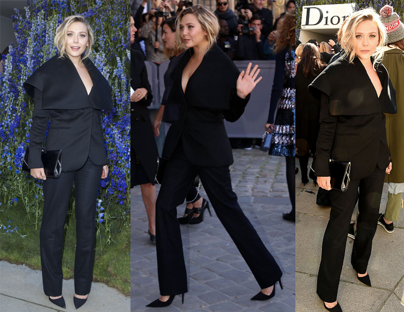 Also stopping by Dior, Lizzie rocked another great all Black look reminiscent of a Hollywood legend like Greta Garbo or Katherine Hepburn in a dramatic oversized collar and wide-legged pants. With those subtle waves and minimal make-up this is beyond alluring.